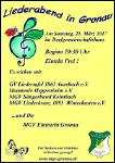 Eine herzliche Einladung an alle Chorfreunde und Liebhaber des Chorgesangs. Der Männergesangverein Eintracht Gronau veranstaltet am Samstag, 25. März um 19. 30 Uhr seinen Liederabend im Dorfgemeinschaftshaus Gronau. Teilnehmende Vereine sind: MGV Harmonie Heppenheim, GV Liedertafel Auerbach, MGV Sängerbund Kolmbach und sein Junger Chor , MGV Liederkranz Winterkasten und natürlich der Gastgeber des Abends, der MGV Eintracht Gronau unter der Leitung seines Dirigenten Otto Lamadé. Der Eintritt zu der Veranstaltung ist frei, für Speisen und Getränke ist bestens gesorgt.