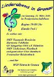 Eine herzliche Einladung an alle Chorfreunde und Liebhaber des Chorgesangs. Der Männergesangverein Eintracht Gronau veranstaltet am Samstag, 25. März um 19. 30 Uhr seinen Liederabend im Dorfgemeinschaftshaus Gronau. Teilnehmende Vereine sind: MGV Harmonie Heppenheim, GV Liedertafel Auerbach, MGV Sängerbund Kolmbach und sein Junger Chor , MGV Liederkranz Winterkasten und natürlich der Gastgeber des Abends, der MGV Eintracht Gronau unter der Leitung seines Dirigenten Otto Lamadé. Der Eintritt zu der Veranstaltung ist frei, für Speisen und Getränke ist bestens gesorgt.